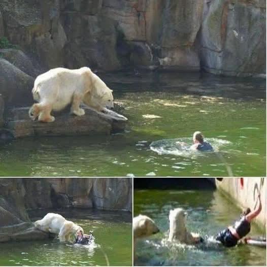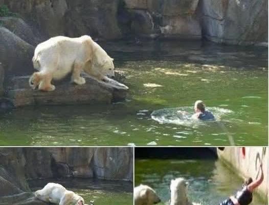 To the shock of onlookers that was the sound of a 32-year-old woman who was now inside the exhibit and swimming towards the polar bears.