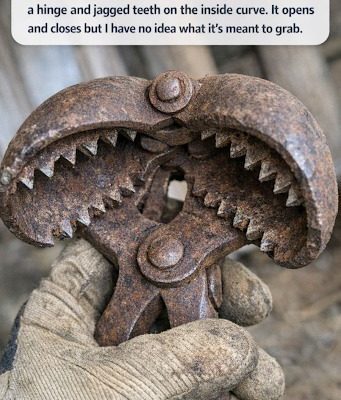 That description actually points pretty clearly to an old agricultural gripping tool—most likely a hay or ice tongs.
